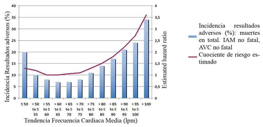 Figura 1 Impacto de la frecuencia cardíaca (FC) en paciente hipertensos y con cardiopatía coronaria (Modificado de: Kolloch R, Legler UF, Champion A, et al. Impact of resting heart rate on outcome in hypertensive patients with coronary artery disease: International Verapamil–SR/trandolapil STudy (INVEST). Eur Heart J 2008; 29: 1327-34).