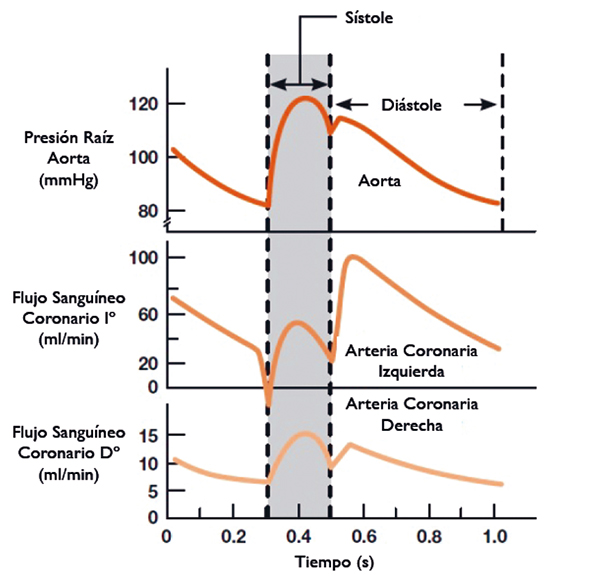 Bajo condiciones normales, la perfusión miocárdica durante la fase de relajación isovolumétrica es más alta en el lado coronario izquierdo (Figura 4), sin embargo, la arteria coronaria derecha muestra una dominancia de flujo en sístole 20 . Por esta razón, una disminución del diástole por un aumento en la FC causará una disminución en la perfusión del lado izquierdo. Así también, una hipotensión causará una reducción en el flujo de ambas coronarias. Este mecanismo es ciertamente el principal involucrado en la reducción de la perfusión miocárdica.