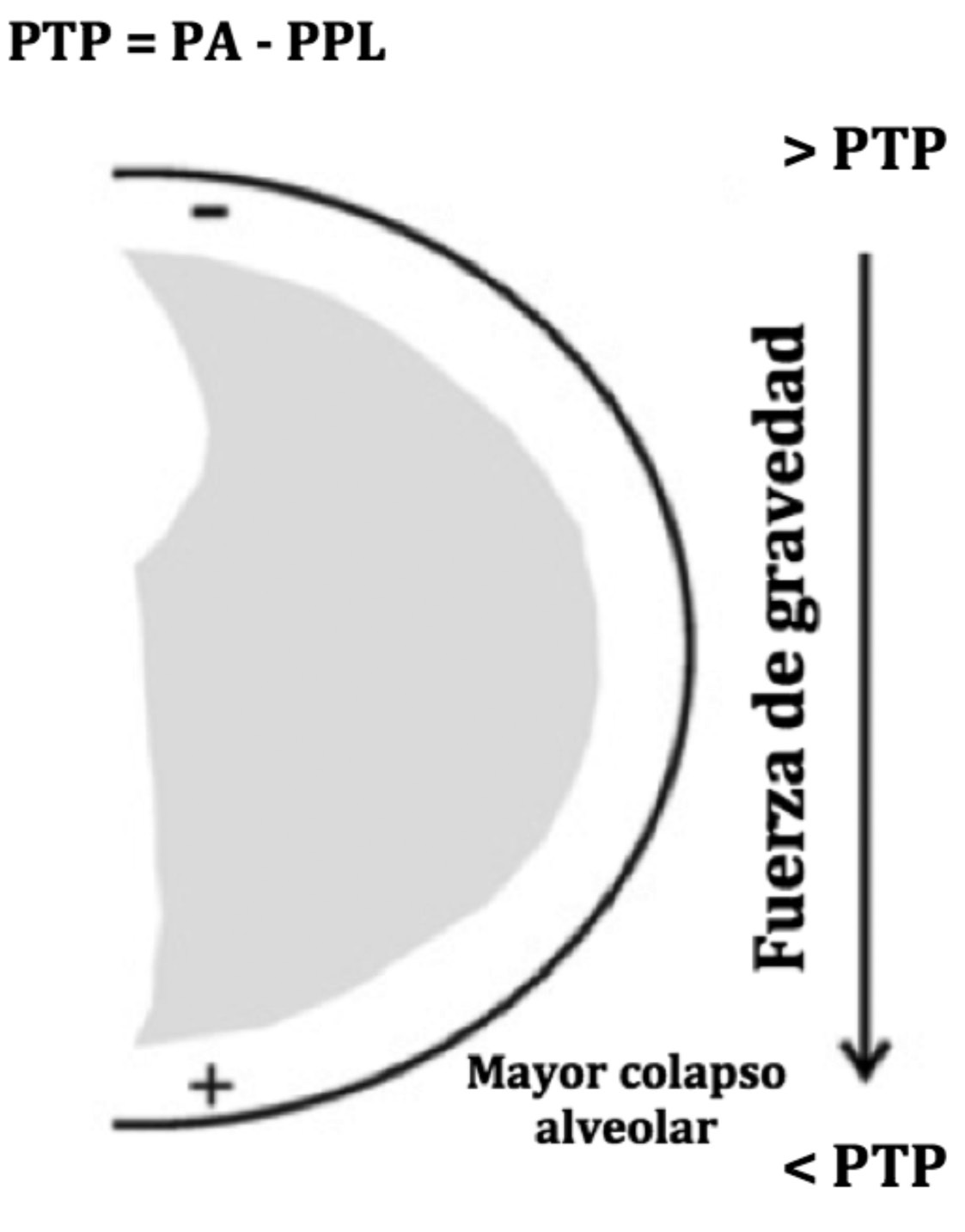 La presión transpulmonar, que es la presión ejercida hacia afuera del alvéolo durante todo el ciclo respiratorio y que depende de la presión en la vía aérea o presión intra-alveolar menos la presión pleural. Ya que la presión pleural se hace más positiva por efecto de la gravedad, las zonas más dependientes tendrán menor presión transpulmonar y por tanto mayor tendencia al colapso (Figura 1).