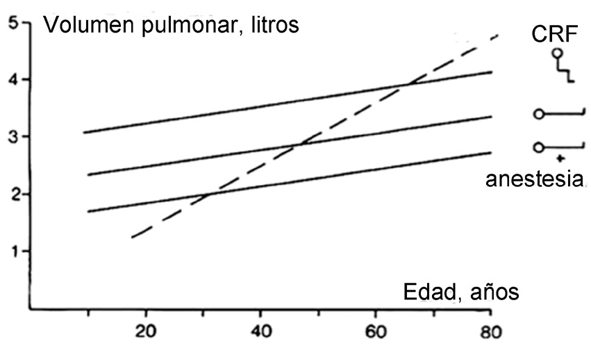 Figura 2 Esta figura resume los cambios que ocurren en la capacidad residual funcional (CRF) con la edad, con los cambios de posición y la inducción de anestesia general. Hay una disminución de 0,7 a 0,8 L de la CRF por el paso de la posición de pie al decúbito y una caída adicional de 0,4 a 0,5 L por efecto de la anestesia. Aunque la CRF aumenta con la edad la capacidad de cierre (CC) aumenta más rápido, de tal forma que cierto grado de colapso de la vía aérea ocurrirá en posición de pie luego de los 65 años y alrededor de los 50 años si se está en posición supina. Con la disminución adicional de la CRF durante la anestesia muchos pacientes sufrirán algún grado de colapso de su vía aérea (Modificado de Hedenstierna G et al, Best Pract & Clin Anaesth 2010; 24:157-169 14 ).