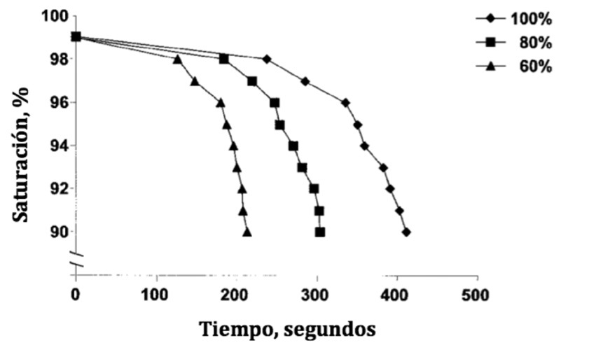 Figura 4 Esta curva muestra la caída de la saturación de oxígeno durante la apnea en pacientes que fueron preoxigenados con concentraciones de O2 de 100%, 80% y 60% durante la inducción anestésica. Los tiempos promedios en llegar a una saturación de 90% fueron 411 ± 84, 303 ±59 y 213 ± 69 segundos usando O2 al 100%, 80% y 60% respectivamente (Modificado de Edmark L et al, Anesthesiology 2003; 98: 28-33 54 ).