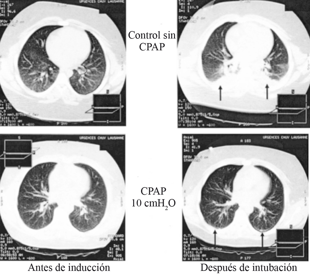 CPAP de 40 cm de H2O revierte las atelectasias, evaluado por TAC. |