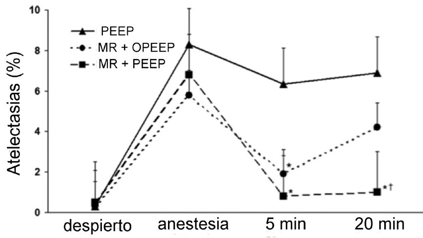 Durante el mantenimiento anestésico, el uso de PEEP ha demostrado que aumenta la CRF, mejorando la oxigenación y disminuyendo las atelectasias postoperatorias 61 . Sin embargo, dado que cada unidad alveolar tendrá su propia presión de apertura y de cierre, el nivel de PEEP usualmente utilizado en anestesia (4 a 10 mmHg), puede ser insuficiente para abrir la vía aérea ya colapsada y puede incluso sobredistender zonas normalmente ventiladas, produciendo alteraciones V/Q que favorecen el espacio muerto. Es por esta razón que en algunos pacientes el uso aislado de PEEP sin aplicar previamente maniobras de reclutamiento alveolar puede ser insuficiente para manejar las atelectasias. En un estudio presentado por Reinius y cols. 62 , 30 pacientes obesos mórbidos (IMC 45), sometidos a bypass gástrico, se randomizaron en 3 grupos de tratamiento: PEEP de 10 cm de H2O, maniobra de reclutamiento (MR) con 55 cm de H2O por 10 segundos sin PEEP posterior y MR + PEEP. Se realizó TAC de tórax despierto, 5 minutos después de la inducción y 5 y 20 minutos después de la cirugía. Las MR + PEEP redujeron el porcentaje de atelectasias, manteniéndose su efecto en el tiempo. Las MR solas fueron efectivas en disminuir las atelectasias, pero su efecto fue transitorio. El uso de PEEP aislado no redujo el porcentaje de atelectasias (Figura 6).
