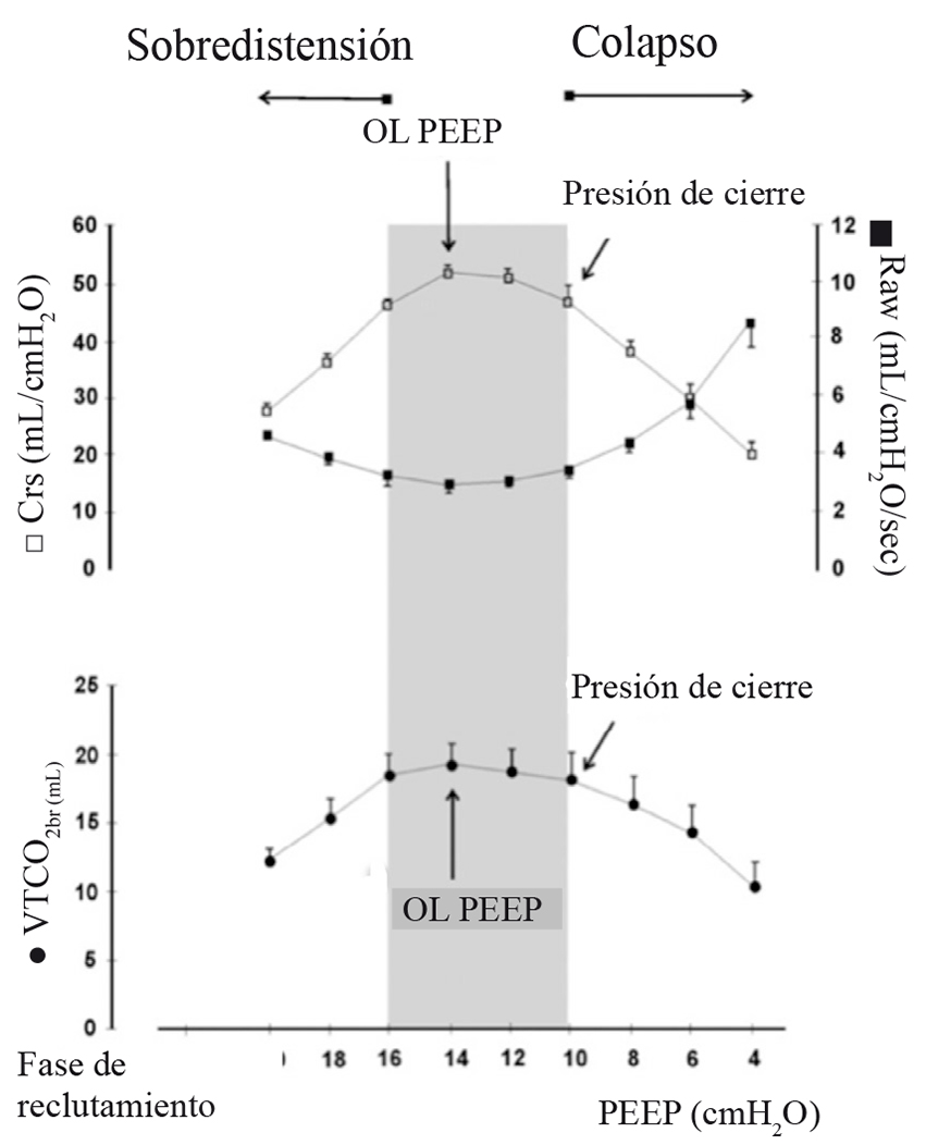 Figura 7 Determinación de la OL-PEEP (del inglés PEEP de pulmón abierto) durante la fase de titulación de PEEP. Cada nivel de PEEP se mantuvo por 2 min o 30 respiraciones. La compliance respiratoria dinámica (Crs), resistencia de la vía aérea (Raw) y la eliminación de CO2 por cada respiración (VTCO2,br) fue registrada no invasivamente con sensores adecuados ubicados en la vía aérea. La OL-PEEP y la presión de cierre de los pulmones se marcan con las flechas. El área gris muestra el rango seguro de PEEP, en este paciente en particular, que no causa sobredistensión ni colapso (Modificado de Tusman G et al, Curr Anaesth Crit Care 2010; 21: 244-249 60 ).