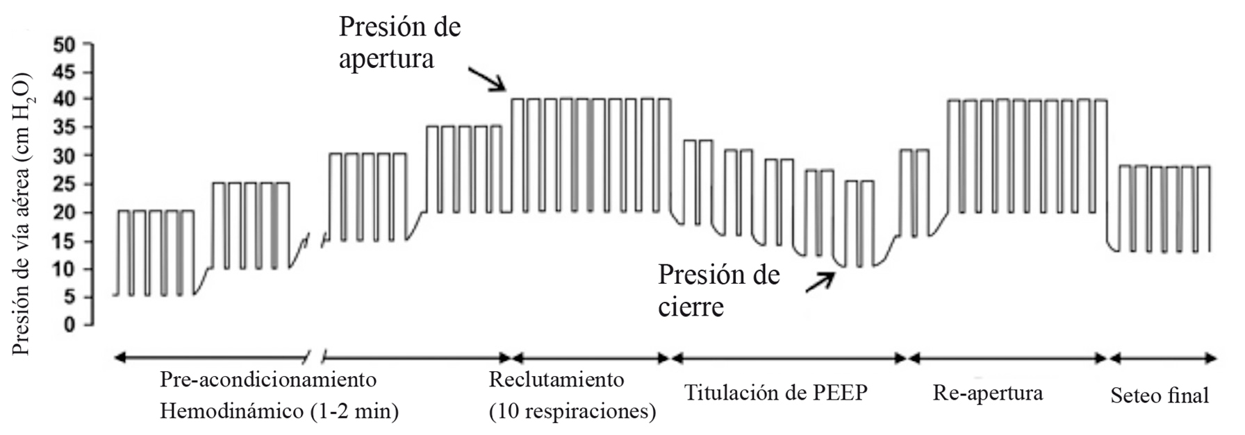 Son estrategias que buscan expandir las áreas de pulmón colapsado por medio del aumento de la presión transpulmonar. Bendixen y cols., en 1963 fueron los primeros en describir cómo al aplicar una presión de 40 cm de H2O en la vía aérea por 15 segundos, se podía mejorar la oxigenación y la distensibilidad pulmonar 63 . Iniciando la década del 90, Lachmann, estudiando pacientes críticos, estableció que el pulmón puede ser expandido usando una alta presión en la vía aérea y después mantenerse abierto si se aplica una PEEP suficiente para evitar un nuevo colapso 64 . Estos conceptos han sido extrapolados y aplicados durante el período intraoperatorio y gracias a la disponibilidad de mejores ventiladores, estas maniobras son ahora más reproducibles y controladas 8 .
