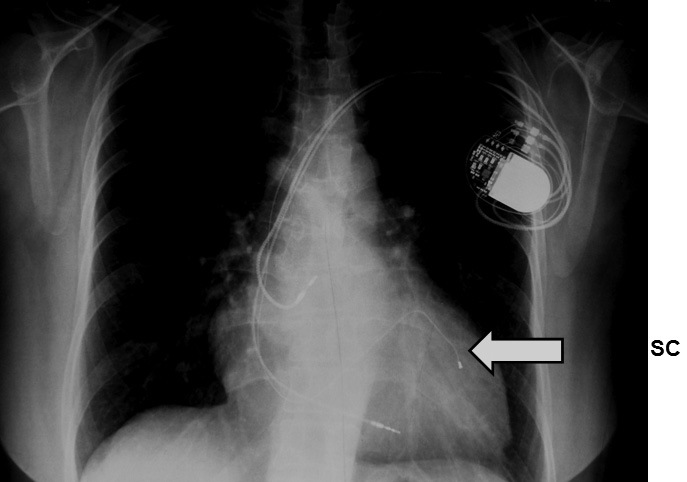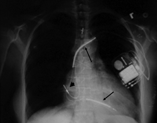 Figura 2 Radiografía de un paciente portador de un marcapaso para terapia de resincronización ventricular. La flecha señala el electrodo que estimula el ventrículo izquierdo a través del seno coronario.