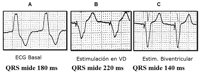 La estimulación biventricular o TRV, desarrollada en las últimas 2 décadas, es uno de los avances más importantes en el manejo de la insuficiencia cardiaca, al demostrarse que en pacientes bien seleccionados mejora los parámetros de función ventricular, la capacidad funcional, la calidad de vida, y la sobrevida 6 , 10 . Las bases para la TRV se fundamentan en las observaciones de que un retardo de conducción intraventricular, cuya manifestación electrocardiográfica más común es el bloqueo completo de la rama izquierda, se asocia a una contracción ventricular asincrónica, ya que el septum interventricular se contrae antes que los segmentos basales y laterales del VI. Esto implica que algunos segmentos del VI se contraen mientras otros se están relajando, lo que repercute negativamente en la función sistólica y diastólica ventricular izquierda y produce insuficiencia mitral, entre los efectos más importantes 5 .