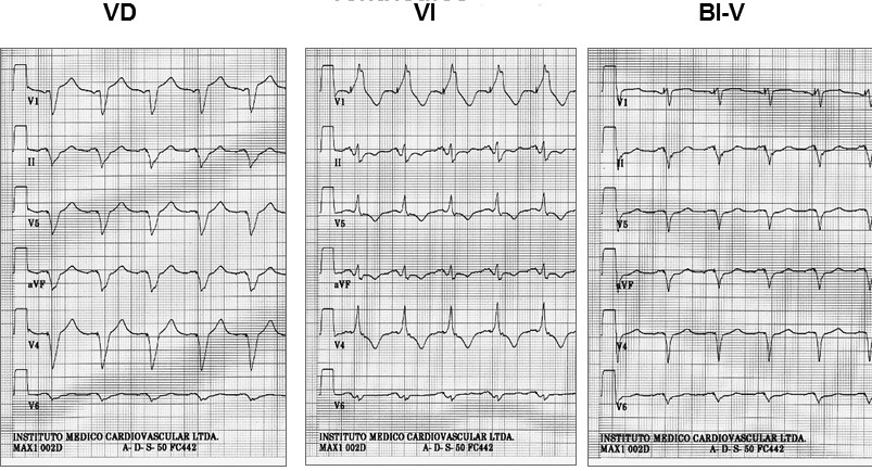 Figura 4 ECG de derivaciones precordiales durante pacing en ventrículo derecho (VD), ventrículo izquierdo (VI) y simultáneo en ambos ventrículos (BI-V).