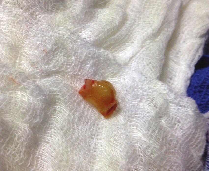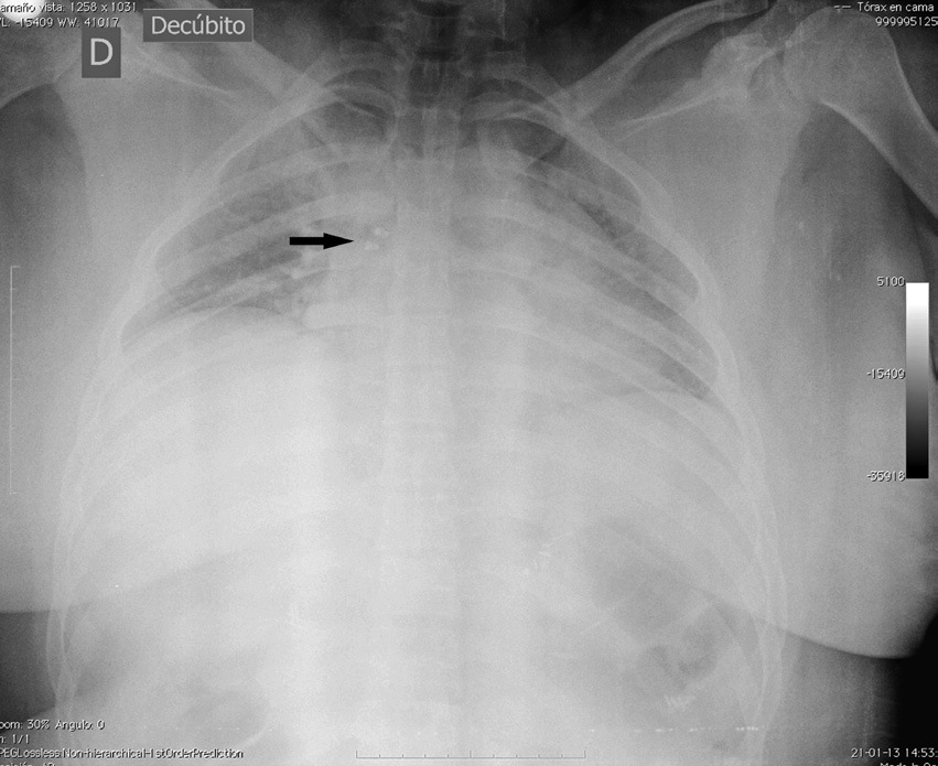 En el postoperatorio inmediato la paciente acusa la ausencia de prótesis transitoria de incisivo central superior izquierdo. (Figura 1). Se realiza radiografía de tórax y abdomen simple, que revela presencia de cuerpo extraño en bronquio fuente derecho. (Figura 2). La prótesis es removida sin complicaciones mediante fibrobroncoscopia a las 8 h del post-operatorio bajo anestesia general.