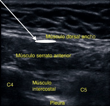 Figura 7 Sonoanatomía BRCL. Flecha entre músculos serrato e intercostal donde se deposita anestésico local.
