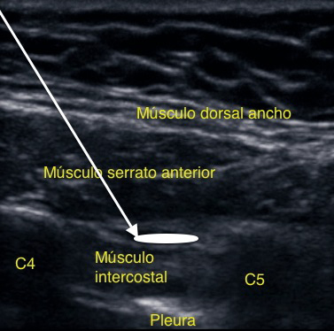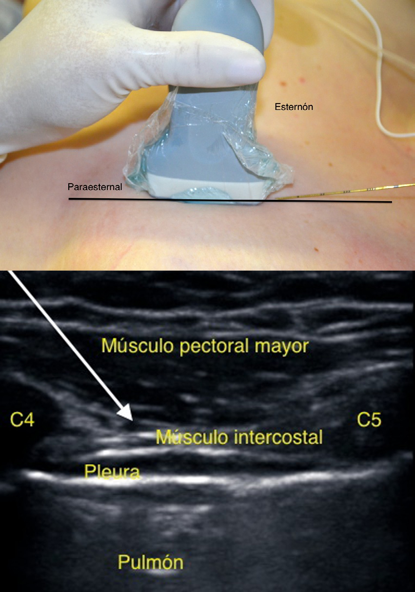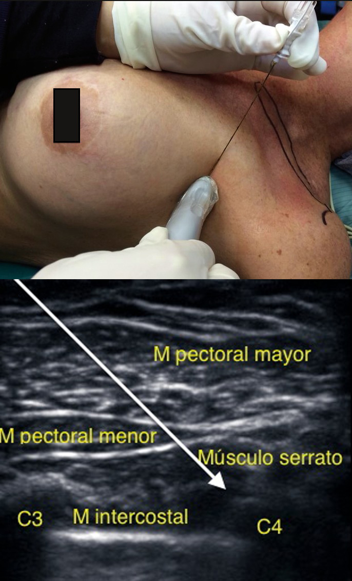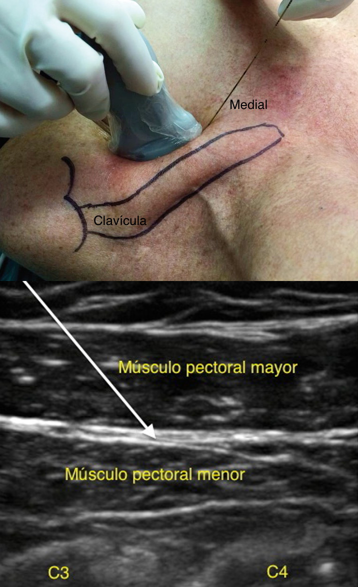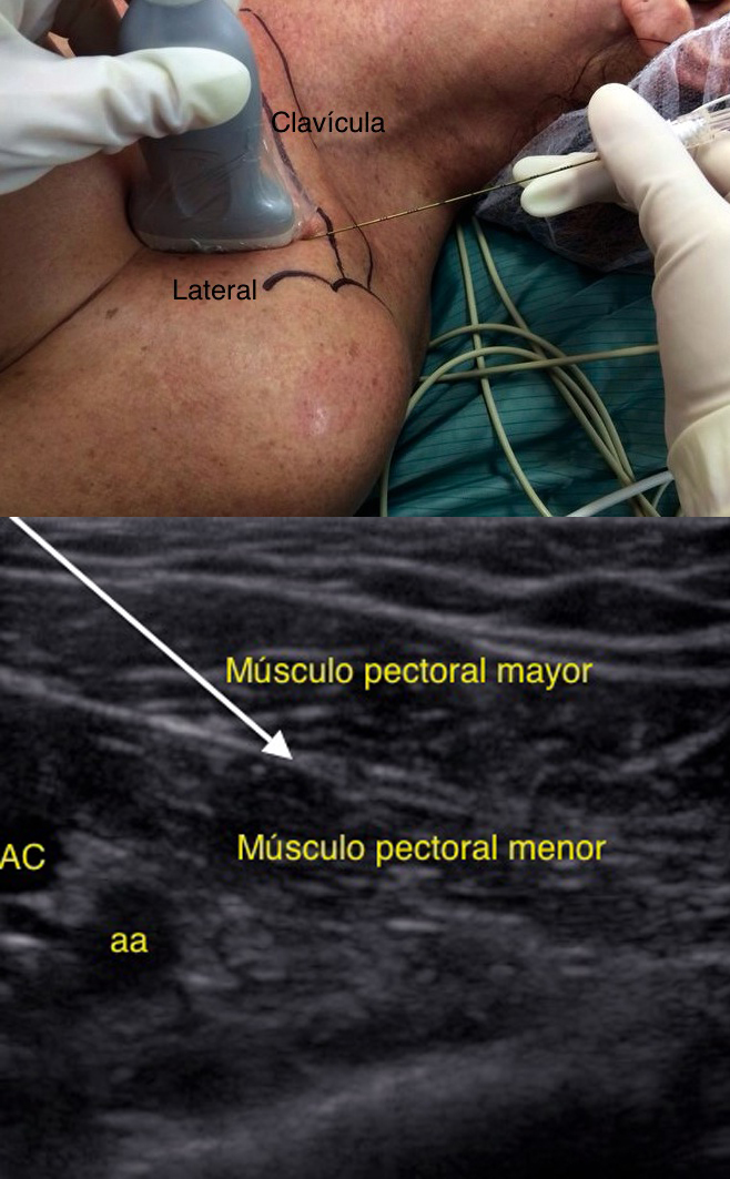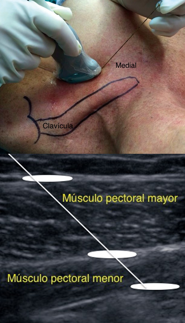 Abordaje infraclavicular: Pérez y col. describen un acceso diferente. Se ubica el transductor bajo el tercio externo de la clavícula, transversal al eje del paciente. Se identifican los músculos pectoral mayor y menor; con Doppler se ubica la arteria toracoacromial y la vena cefálica. En un plano más profundo se visualizan las costillas y la pleura.