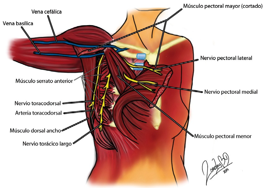 La aguja se introduce desde medial a lateral en un ángulo de 45º, alejándose lo más posible de estructuras como la pleura y vasos sanguíneos. El nervio pectoral lateral se encuentra lateral a la arteria. La hoja posterior se despega fácilmente con la infiltración del fluido. Es en este plano donde se logra el bloqueo de los nervios pectorales medial y lateral, pues ambos atraviesan la hoja profunda de la fascia pectoral para inervar al músculo pectoral mayor 10 (Figura 4).