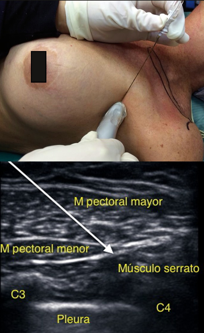 El objetivo es depositar el anestésico local en el plano interfascial entre la hoja profunda de la fascia pectoral y la fascia clavipectoral; es decir, entre los músculos pectoral mayor y menor. Permite el bloqueo sensitivo de ambos músculos. El paciente se ubica en decúbito supino con el brazo ipsilateral pegado al cuerpo y la cabeza girada hacia el lado contrario. Existen 2 abordajes:
