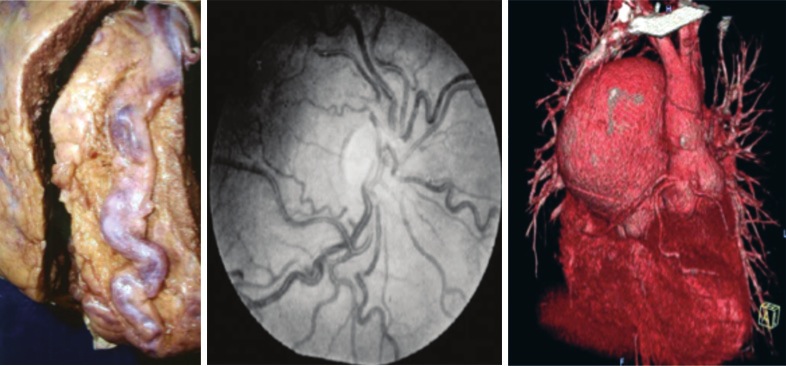 Figura 1 Imágenes que muestran algunas de las alteraciones vasculares propias de los pacientes cianóticos crónicos. La primera imagen corresponde a una arteria coronaria descendente anterior muy dilatada y tortuosa. La segunda imagen muestra el fondo de ojo donde se observa dilatación de arterias y venas retinales y en la tercera imagen se observa un aneurisma de la arteria pulmonar (Cardiol Young 2010; 20: 242-253).