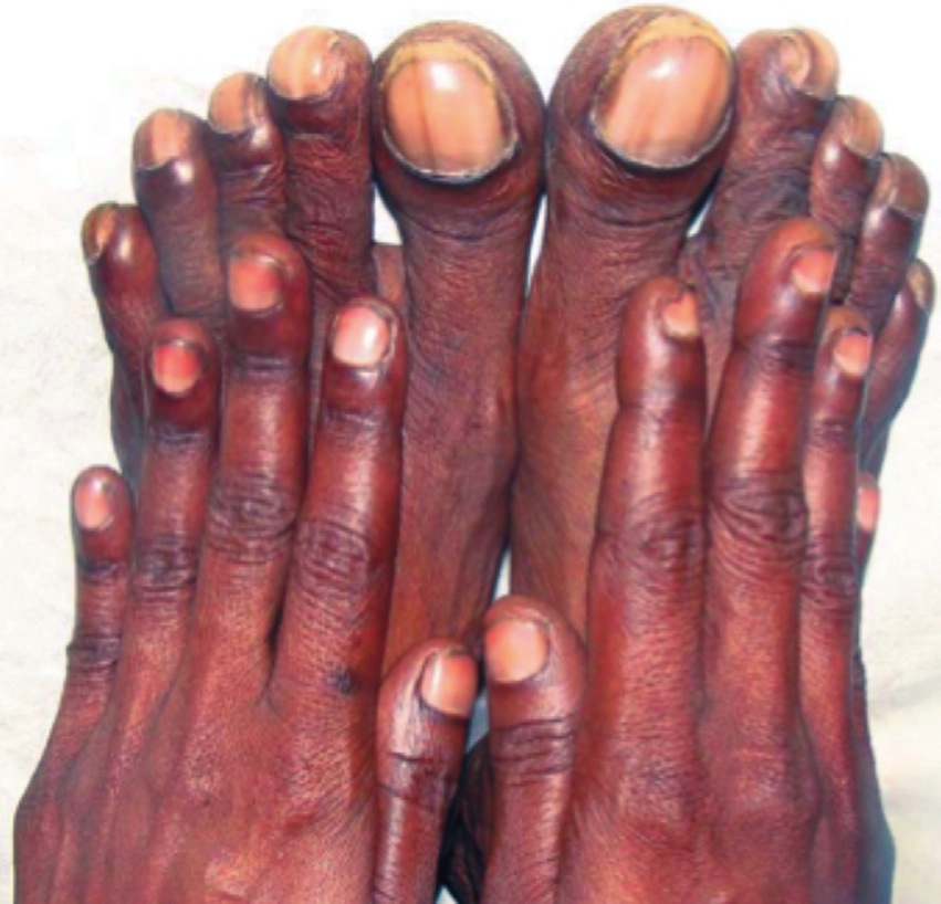 Figura 2 Manos y pies de un paciente de 30 años con ductus arterioso persistente y cianosis crónica por shunt de derecha a izquierda. En este caso los pies tienen dedos en palillo de tambor más marcados porque por la ubicación del shunt han recibido mayor cantidad de sangre desoxigenada (NEJM 2011; 364: 7).