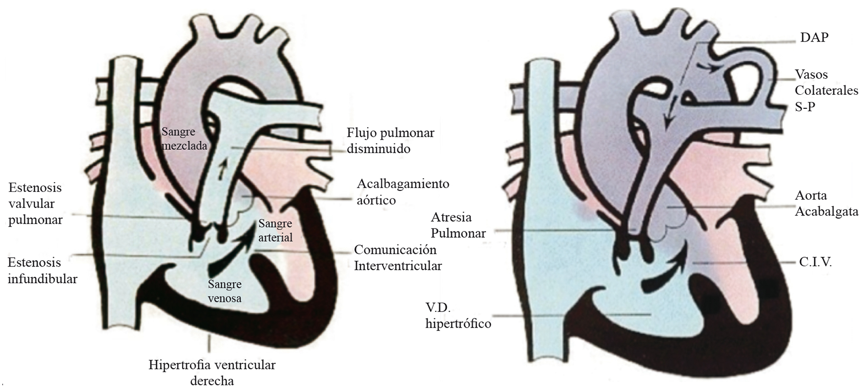 Figura 3 Cianosis por disminución del flujo sanguíneo pulmonar (Tetralogía de Fallot. En la figura de la derecha se muestra la imagen de una Tetralogía de Fallot (TF) clásica, en la que el flujo sanguíneo pulmonar está disminuido por la obstrucción a la salida del ventrículo derecho (V.D.), y la comunicación interventricular (C.I.V.) tiene flujo de derecha a izquierda que produce cianosis. La figura de la izquierda muestra una TF con obstrucción total de la salida del V.D por atresia pulmonar. En este caso el flujo pulmonar está disminuido y es dependiente de un ductus arterioso persistente (DAP) o de vasos colaterales de arterias sistémicas hacia arterias pulmonares (S-P) (Imágenes modificadas de Images paediatri Cardiol 1999; 1 (1): 18-21).