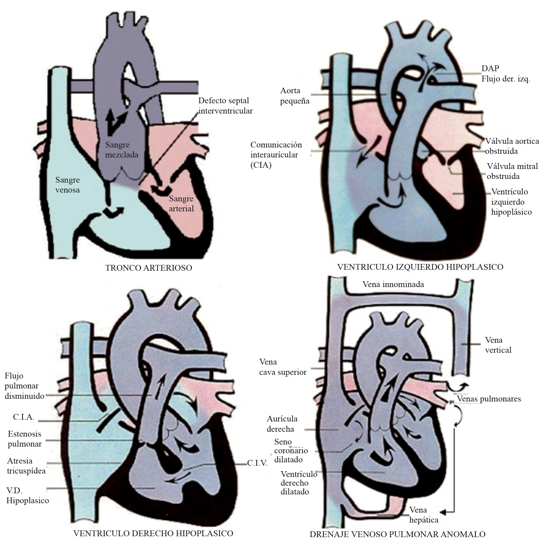 Cianosis por mezcla de sangre venosa y arterial en una cámara común: tronco arterioso (TA), hipoplasia de ventrículo izquierdo o ventrículo derecho, drenaje venoso pulmonar anómalo total (DVPAT) (Figura 4).