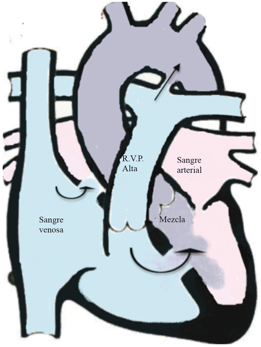 Figura 4 Cianosis por mezcla de sangre arterial y venosa en una cámara común. Tronco Arterioso: Hay una mezcla completa de la sangre arterial y venosa en un vaso común que da origen a la aorta y a la arteria pulmonar. Hay hiperflujo e hipertensión pulmonar severa. Ventrículo izquierdo hipoplásico: Hay obstrucción severa de la válvula mitral y aórtica que impide la formación adecuada del ventrículo izquierdo. La sangre se mezcla a nivel auricular y se eyecta por la arteria pulmonar. La perfusión sistémica es dependiente del ductus (flujo de derecha a izquierda). Hay hiperflujo pulmonar. Ventrículo derecho hipoplásico: Hay atresia tricuspídea que impide la adecuada formación del ventrículo derecho. La sangre se mezcla a nivel auricular y se eyecta por la aorta y la pulmonar (en algunos casos hay atresia pulmonar, haciéndose la circulación pulmonar ductus dependiente). Drenaje venoso pulmonar anómalo: El drenaje venoso pulmonar llega a venas sistémicas y no a la aurícula izquierda. Puede ser supracardíaco (si el drenaje va al territorio de la cava superior), infracardíaco (si el drenaje va al territorio de la cava inferior) o cardíaco (si el drenaje es al seno coronario). Hay congestión severa de cavidades derechas e hipertensión pulmonar venosa y arterial severa. Es una urgencia neonatal (Modificadas de Images paediatri Cardiol 1999; 1: 18-21).