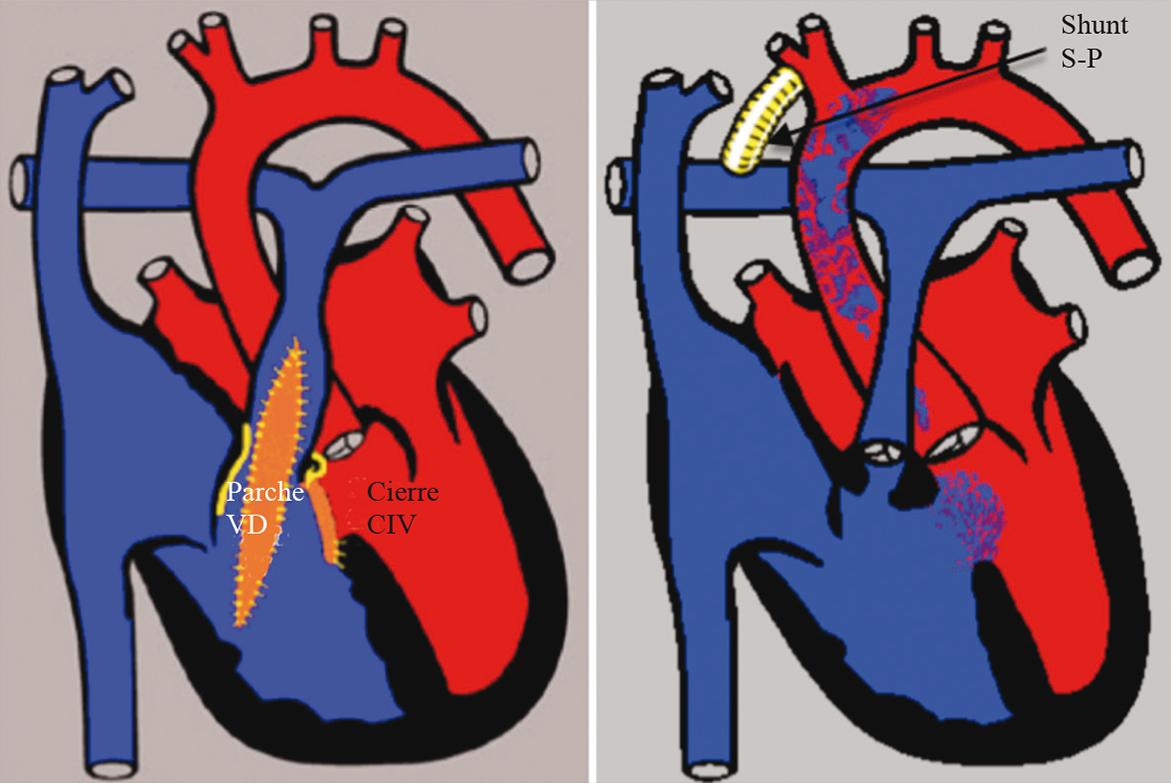 Figura 7 Manejo quirúrgico de la tetralogía de Fallot. La imagen de la derecha muestra la corrección definitiva de una tetralogía de Fallot que consiste en cerrar la comunicación interventricular (CIV) y ampliar la salida del ventrículo derecho (VD) con un parche infundibular y transanular. La figura de la izquierda muestra un shunt de Blalock-Taussing (entre la arteria subclavia derecha y rama pulmonar derecha), que es un procedimiento paliativo para aumentar el flujo sanguíneo pulmonar. Shunt S-P: Shunt sistémico pulmonar.