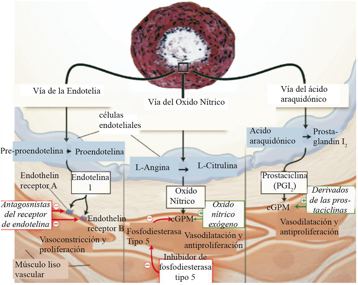 El aumento de flujo sanguíneo pulmonar y de presión pulmonar lleva a una remodelación de los vasos pulmonares que al parecer involucra vasoconstricción, inflamación, trombosis, proliferación celular y fibrosis 44 . En estos mecanismos están implicados mediadores vasoactivos tales como endotelina-1, tromboxano, prostaciclinas y Óxido Nítrico (NO) 44 . Las 3 principales vías implicadas en el desarrollo de HP y a donde se dirige la terapia médica se ilustran en la Figura 8.