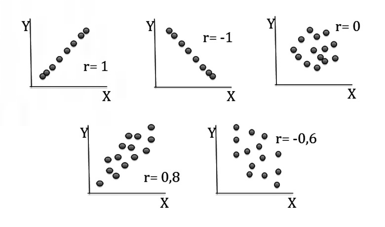 Datos de este tipo generan una nube de puntos elíptica en la que el grado de elongación de la elipsis se relaciona con la magnitud del coeficiente de correlación. Este patrón puede ser difícil de detectar en casuísticas pequeñas. Si los datos no tienen una distribución Normal, una o las dos variables pueden ser transformadas, observando nuevamente la nube de puntos que generan. En la Figura 1, se grafican los valores de X e Y en nubes de puntos y se puede ver varias alternativas y sus correspondientes valores de r. Mientras más cerrada es la nube, mayor es el valor de r.