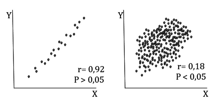 Figura 2 El hecho que r alcance significación estadística, es decir que sea diferente de cero, depende del tamaño de la muestra. Muestras pequeñas con r grandes pueden no alcanzar significación; a la inversa, muestras grandes con r pequeños pueden alcanzar significación estadística aunque no la tengan clínicamente. En la figura la fuerza de la asociación es ostensiblemente mayor en la figura de la izquierda (“no significativa”) y menor en la de la derecha (“significativa”).
