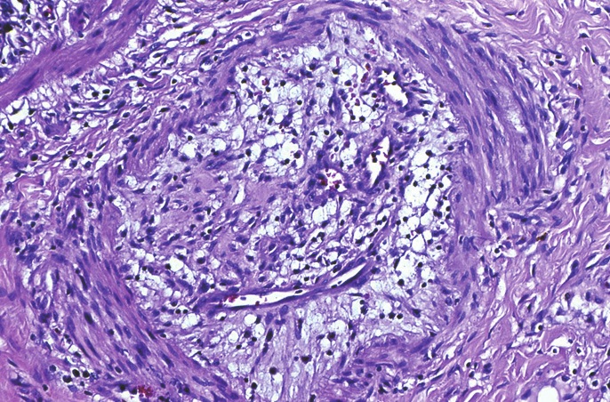 Figura 1 Microfotografía que muestra una rama de pequeño calibre de la arteria pulmonar con oclusión del lumen, fibrosis laxa y vasos sanguíneos de neoformación. Aumento 200x, hematoxilina y eosina. Cortesía del Dr. Sergio González B. Departamento de Anatomía Patológica, Facultad de Medicina UC.