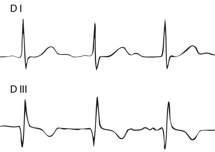 Figura 2 Trazado electrocardiográfico característico de un patrón S1Q3T3 sugerente de hipertensión pulmonar. Se observa onda S en D I, onda Q en D III y onda T negativa en D III.