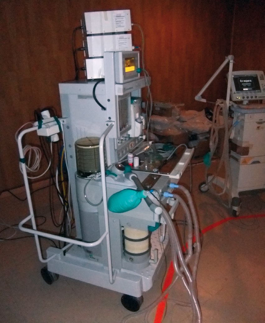 De esta manera, un equipo de anestesiólogos programó el procedimiento paso a paso y dispuso en la sala el resonador de 2 conexiones de oxígeno unidas a una red central (Figura 1), generando presiones de 345 kPa cada una, 2 conexiones de aspiración unidas a una red central de -15 kPa cada una, una máquina de anestesia (Datex-Ohmeda Aestiva/5 MRI) (Figura 2), un ventilador (Maquet, Servo I MRI), 2 dispositivos bolsa-máscara compatibles con RNM, 4 bombas de infusión (Infusomat® Space), incluidas en jaula farádica B. Braun SpaceStation MRI (Figura 3), 2 monitores multiparámetros (in vivo, Precess MRI). Estas instalaciones y equipos no estaban presentes antes de la planificación del procedimiento y por tanto se efectuaron gestiones para obtenerlas y se realizaron nuevas conexiones o adaptaciones en la sala del resonador.