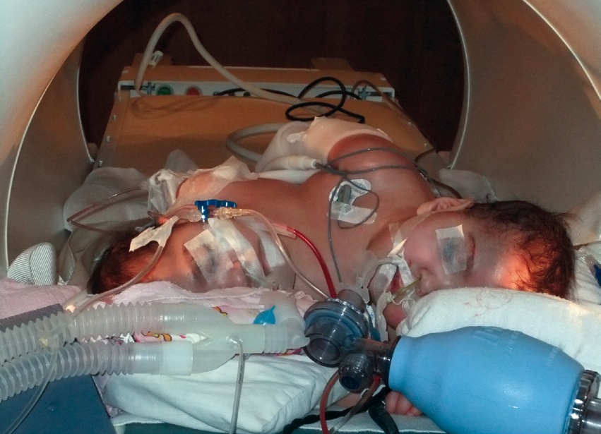 Los casos de gemelos siameses son muy poco frecuentes en el mundo, la incidencia descrita es de 1/50.000 embarazos y 1/250.000 nacidos vivos. Su nacimiento produce un gran impacto social, familiar y económico. Tienen una sobrevida al año no mayor del 10-20% debido a que la mayoría fallece in utero o precozmente después del parto 1 . Este tipo de pacientes representa un enorme desafío en su abordaje para procedimientos que requieran sedación o anestesia general, especialmente fuera de pabellón como es un estudio de resonancia nuclear magnética (RNM), debido al difícil manejo de sus vías aéreas, los cuidados en el transporte y monitorización. Desde el año 1959 se han descrito diversas estrategias para el manejo anestésico de acuerdo a la naturaleza del procedimiento, su duración, los materiales disponibles y las características de los pacientes 2 – 6 .