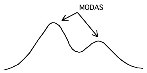 3) Modo o Moda: número, clase o intervalo que tiene mayor frecuencia en la muestra. Estrictamente, sin embargo, conviene definirla como aquel o aquellos valores, clases o intervalos de clases que tienen mayor frecuencia que sus adyacentes. Con esta definición, es posible encontrar distribuciones bimodales o incluso con más modas. En la distribución de la Figura 1, la primera definición sólo aceptaría una moda; estas distribuciones son frecuentes como por ejemplo diversos fenómenos circadianos. Sólo tiene sentido usar la moda cuando se tiene un número grande de datos que, si son continuos, deben estar agrupados en intervalos de clase.