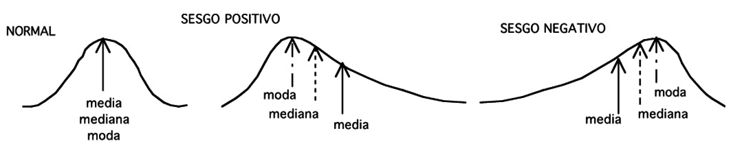 Las relaciones que existen entre las distintas medidas de posición central en una distribución normal y cuando no lo es se aprecian en la Figura 3. En una distribución normal, la media, la mediana y el modo son coincidentes. Cuando la distribución no es normal, las medidas de distribución central difieren entre sí, diferencia que será mayor mientras mayor sea la divergencia con una distribución normal. Si la media es mayor que la mediana la distribución está sesgada hacia la derecha y si es menor que la mediana está sesgada a la izquierda.