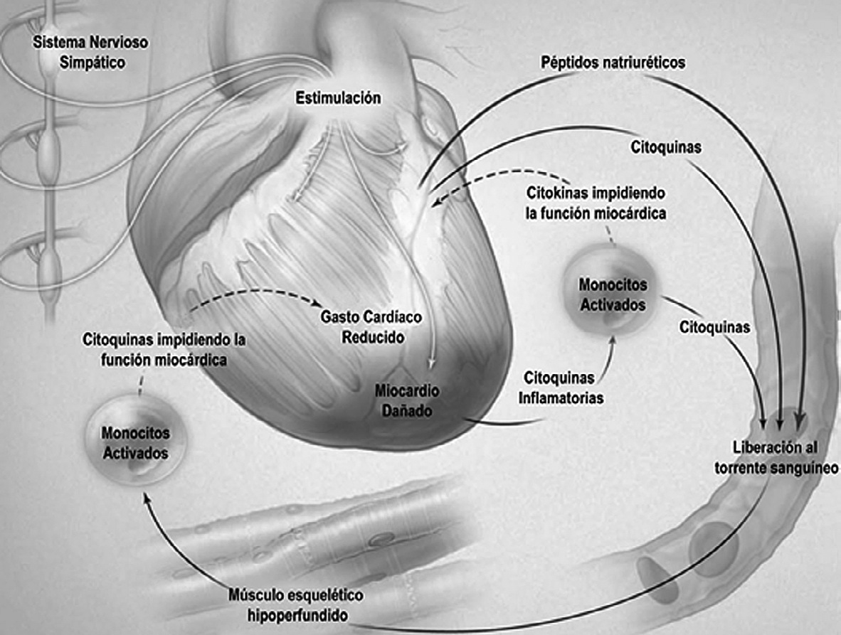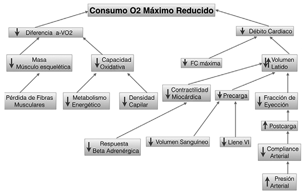 El proceso de envejecimiento involucra múltiples cambios. Uno de los más cruciales es la disminución del consumo de oxígeno 1 (VO2). El VO2 máximo es la máxima cantidad de oxígeno que una persona puede usar realizando un ejercicio dinámico y es un reflejo del gasto cardiaco máximo. La disminución del consumo máximo de oxígeno comienza entre los 20-30 años y cae aproximadamente un 10% por década. Este fenómeno se atribuye a una disminución del metabolismo basal y de la masa de músculo esquelético. La disminución del VO2 de los ancianos va aparejada de una disminución del gasto cardiaco que también es provocada por diversas causas: disminución de la frecuencia cardiaca, menor respuesta adrenérgica, aumento de la presión arterial y por tanto aumento de la postcarga, disfunción diastólica que lleva a una disminución de la precarga. Todos estos fenómenos disminuyen el volumen expulsivo (Figura 1).