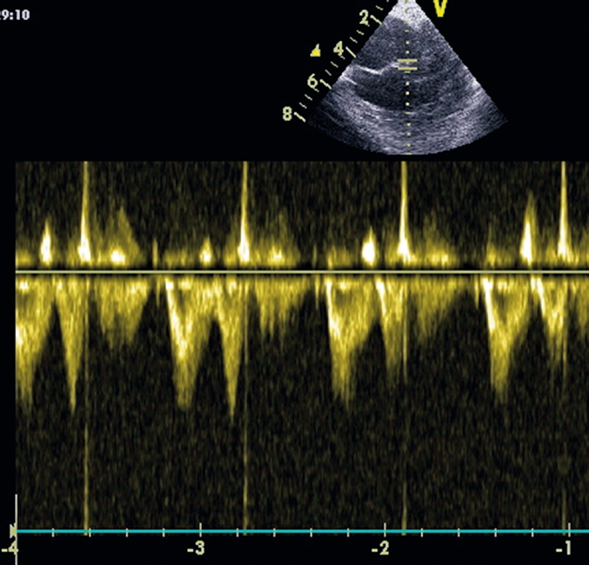 Figura 2 Doppler transmitral. Onda E y Onda A en disfunción diastólica (Gentileza Dr. Renato Chacón A. Anestesiología Clínica Dávila).