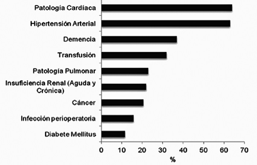 Figura 5 Prevalencia (%) de patologías agregadas en pacientes nonagenarios. (Ojeda E, Gazabatt F. Sobrevida postoperatoria en pacientes nonagenarios. Estudio pronóstico en cohorte retrospectiva 2001-2010, Clínica Dávila. Rev Med Chile 2013; 141: 34-40).