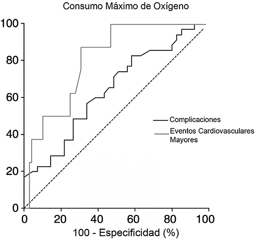 En nuestro estudio de pacientes nonagenarios quirúrgicos 3 , la cirugía más prevalente fue la corrección de una fractura de cadera. Este tipo de cirugía adquiere el carácter de urgencia, puesto que existe evidencia 5 , si bien no es de primera categoría (metanálisis de estudios prospectivos y retrospectivos), que demuestra que la mortalidad a los 30 días y al año aumenta al retardar la cirugía más de 48 horas. De manera que estos pacientes muy ancianos, que probablemente estarán aquejados de patología cardiovascular deberían ser operados en un breve plazo que muchas veces no dará tiempo para completar todas las evaluaciones que se precisan para evitar consecuencias desastrosas. A esto se agrega el que la información clínica acerca de la capacidad funcional es poco clara o nula. Esto último no es menor; un estudio recientemente publicado 6 , demostró que el mejor predictor de complicaciones postoperatorias en general y cardiológicas en particular, eran los test de ejercicio con medición del VO2 (Figura 6), lo que nos lleva al inicio de esta revisión. En ancianos estas pruebas son difíciles de aplicar e imposibles si se trata de un paciente afectado de una fractura de cadera.