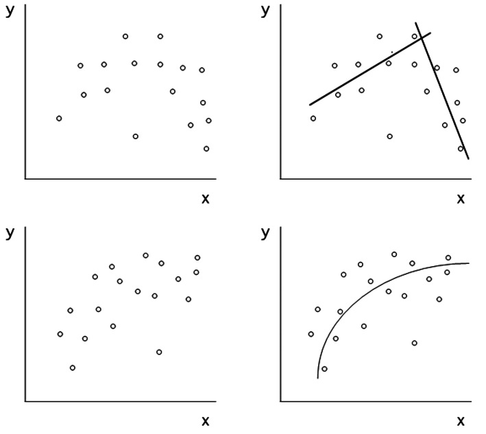 Figura 2 La inspección de la nube de puntos en los gráficos de la izquierda sugiere relaciones distintas de la de una simple recta, tal como se ha trazado en los gráficos de la derecha.