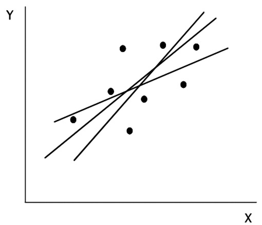 El cálculo de la recta que mejor represente los puntos observados se puede hacer de diversas maneras, buscando aquella que tenga la menor distancia desde los puntos dados. A ojo se pueden proponer alternativas que parecen igualmente válidas pero que son mutuamente excluyentes (Figura 3).