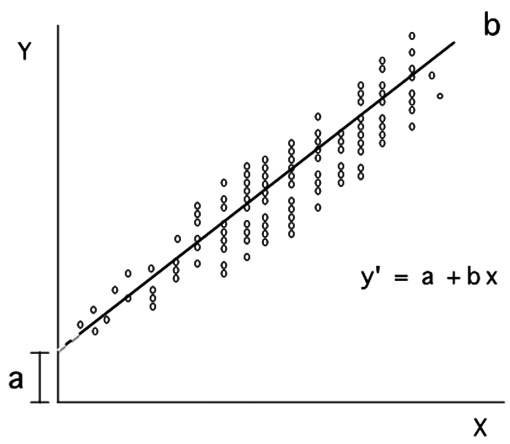 Figura 5 La línea calculada con la ecuación es la que mejor representa los datos, donde a es la intersección de la línea con el eje de las ordenadas y b es la pendiente de la línea.