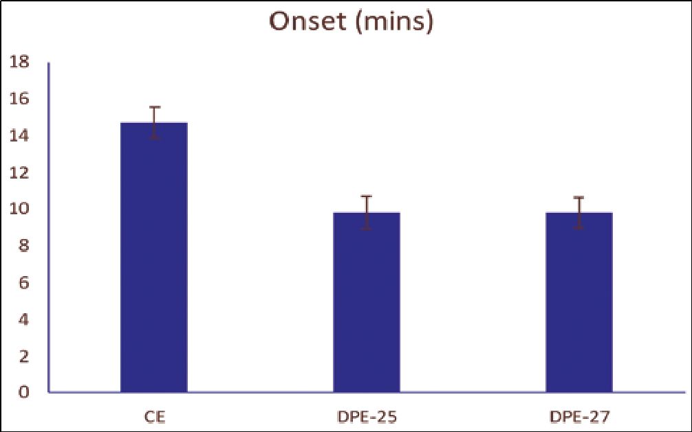 The DPE groups, using 25- and 27 G spinal needles, demonstrated a more rapid onset compared to the CE Group (p < 0.001). However, there were no variations in onset between the two DPE groups (p > 0.99). The average time until achieving adequate analgesia (VAS < 3) was 9.81 minutes in Group DPE- 25 and 9.8 minutes in Group DPE-27, significantly less than 14.69 minutes in the CE Group, and this difference reached statistical significance (P-value < 0.05) (Figure 1).