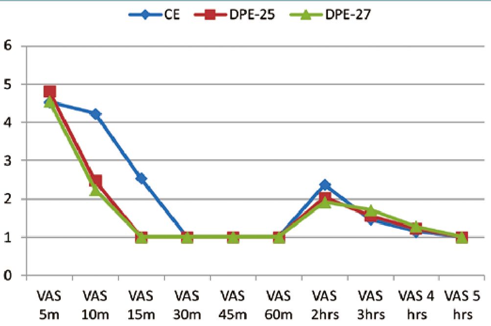 There were no variations in motor blockade degree. Throughout the trial, all patients had a Bromage score of 0, except for one patient in the CE Group, who had a Bromage score of 1-2 for the first hour of analgesia. However, it resolved to a Bromage score of 0 (p = 0.654). The mean VAS parturient score was 4.23 ± 0.43 in the CE group, 2.48 ± 0.58 in DPE-25, and 2.24 ± 0.44 in DPE-27 at minute 10. Conversely, it was 2.54 ± 0.51 in the CE group, 1 ± 0 in DPE-25, and 1 ± 0 in DPE-27 at minute 15. These results denote marked differences between the CE group and the other two DPE groups at minutes 10 and 15. (P < 0.05). However, these differences did not reach statistical significance at any other time (Figure 2).
