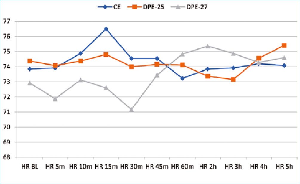 By comparing the three groups, no substantial differences were detected in the hemodynamics (heart rate & blood pressure) from the baseline until the end between the three groups (p > 0.05) (Figures 3 and 4).