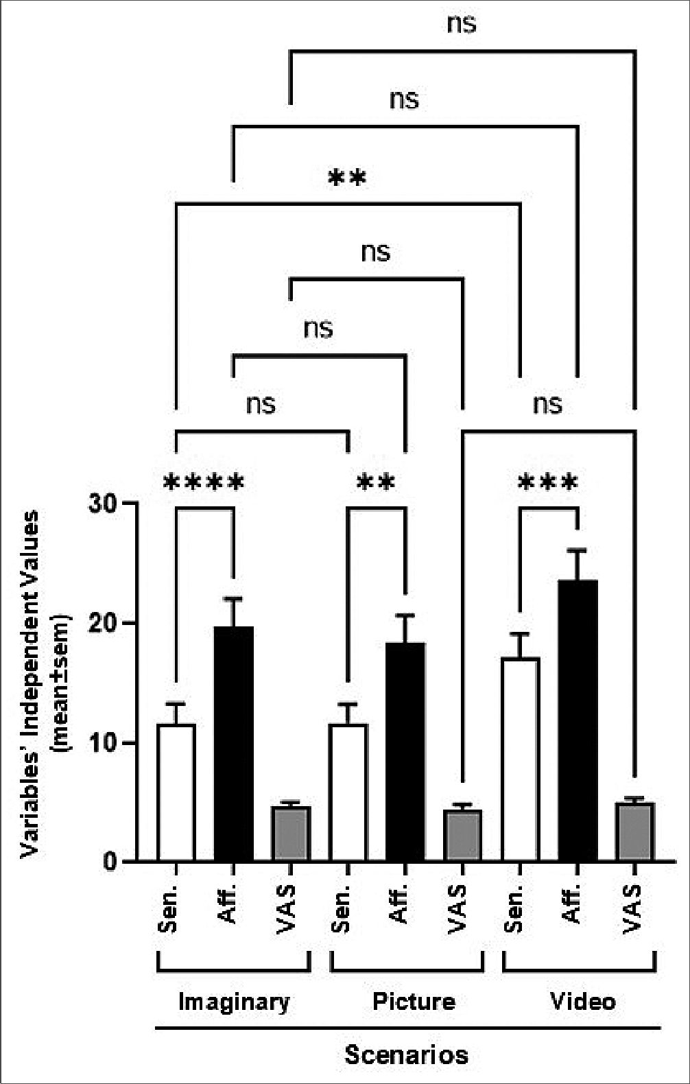 As can be seen, the results reflect that vicarious viewing of different nociceptive contexts may generate pro-nociceptive (painful) effects in the observer, modifying their empathic response and even somatizing the pain of the other. Stimulus presentation was significantly important, with the short video scenario producing the highest level of affectation. The results also highlight the significant empathic effect promoted by affective indicators over sensory indicators, suggesting that both were determinants when evaluating the presented contexts.
