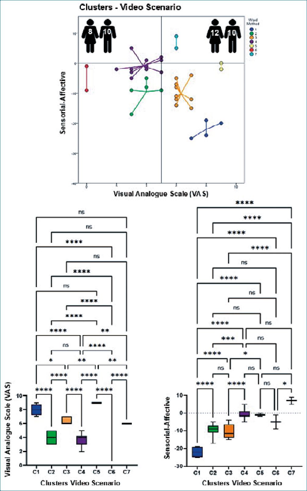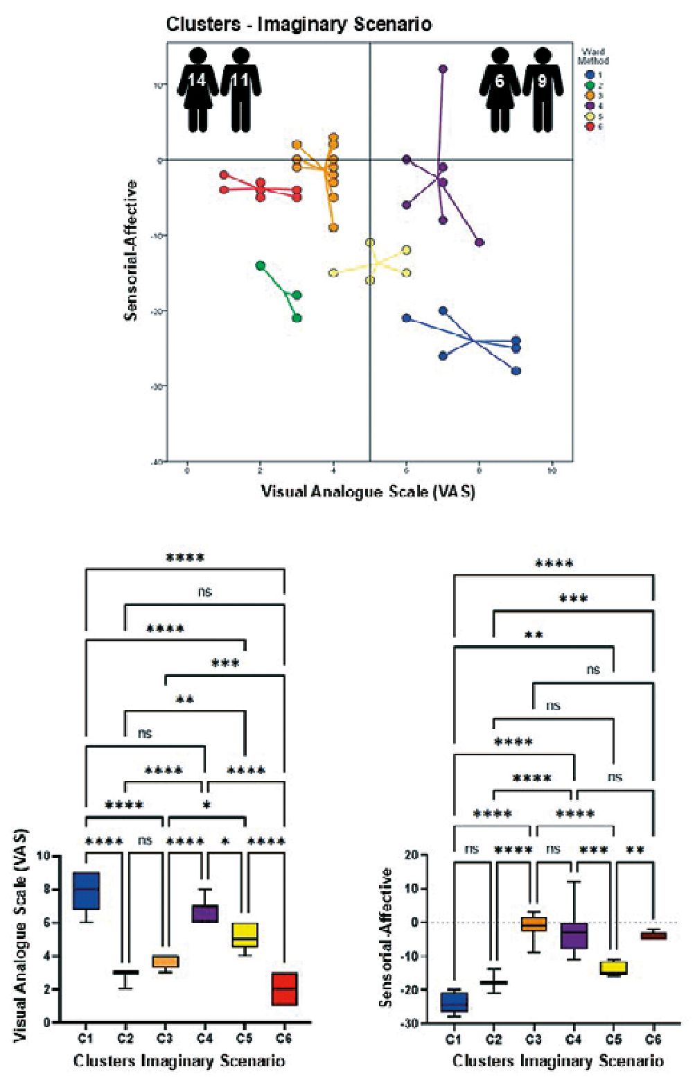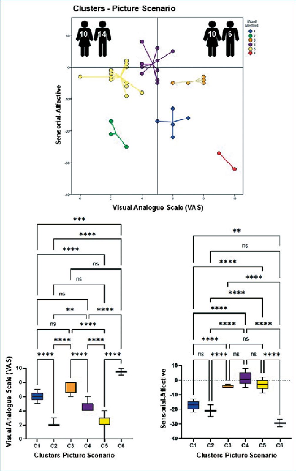 Figures 2-4 show in their upper parts scatterplots of the differences between the sensorial and affective indicators reported by the participants vs. their corresponding VAS values. Negative values of the difference between indicators reflected higher affective qualifications. The vertical line that touched 5 on the VAS axis divided participants into two groups, experiencing less or more pain when exposed to different scenarios. The number of male and female participants is at the top of each graph. It is essential to mention that the original identity of each cluster remained unaltered if at least two original participants did not permute to another cluster. The lower part of the figures shows the results of the ANOVAs for the VAS values and the difference between the indicators per scenario, which helped to support the clustering process. Tables 1-3 show the statistical analysis results and a summary of the dynamic changes, including the tendency to express higher pain values, particularly in female participants, when moving successively through the scenarios.