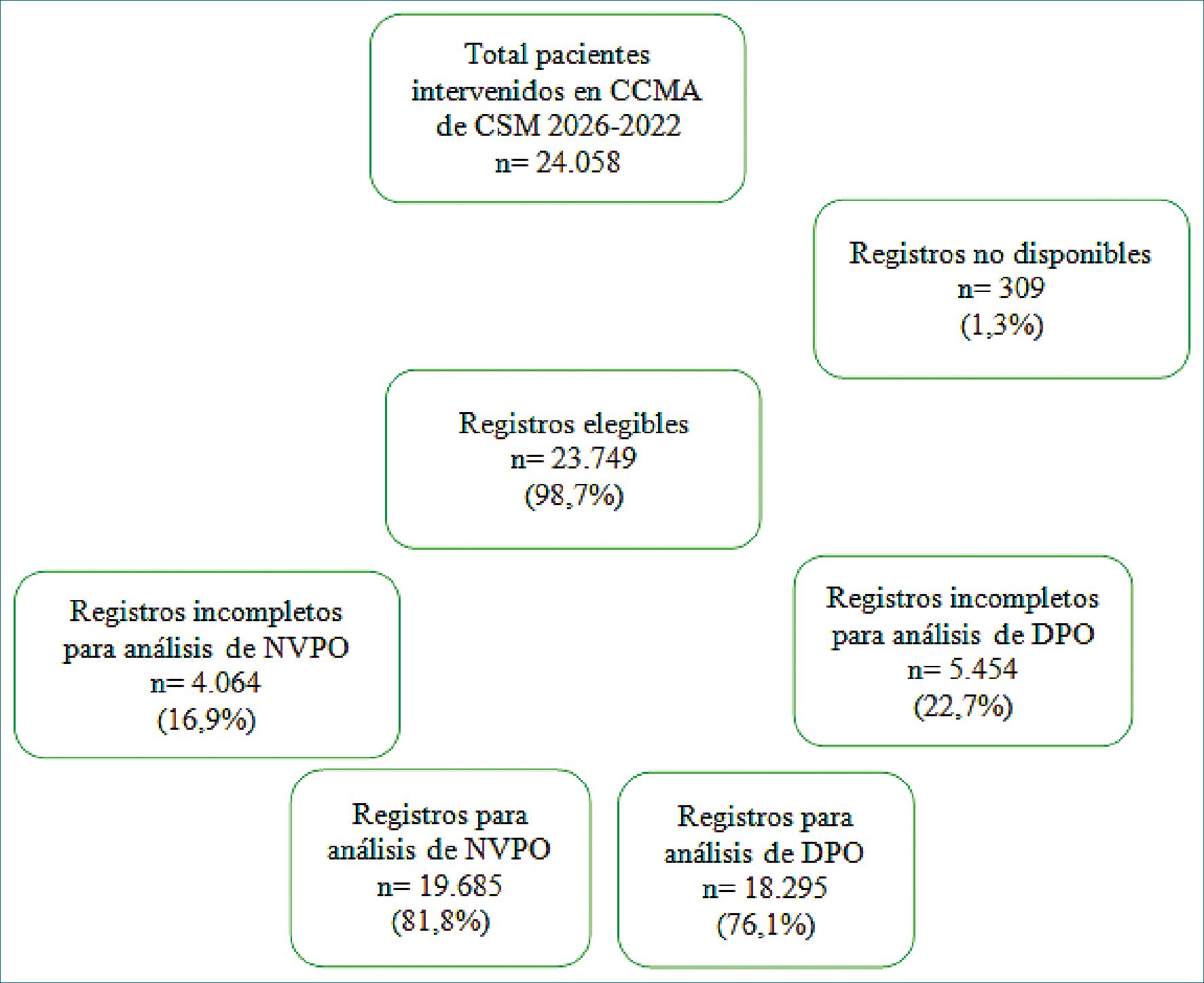 Se analizaron los registros de 24.058 casos intervenidos en el CCMA de la CSM durante el período 2016-2022, de estos fueron válidos para análisis 23.749 registros (pérdida del 1,28%). De éstos, 19.685 permitieron el análisis de la presencia o ausencia de NVPO y 18.295 de DPO (Figura 1). La muestra está conformada por 21,2% de casos < 19 años (5.058/23.749) y 78,7% de casos > 19 años (18.691/23.749). Se evidencia un aumento permanente de la cantidad de cirugías realizadas anualmente en el CCMA de CSM (a excepción del año 2020 a causa de la Pandemia SARS-CoV2), con 6,9% del total de la muestra operados el 2016 (1.539/23.749) versus 24,5% del total de la muestra operados el 2022 (5.838/23.749).