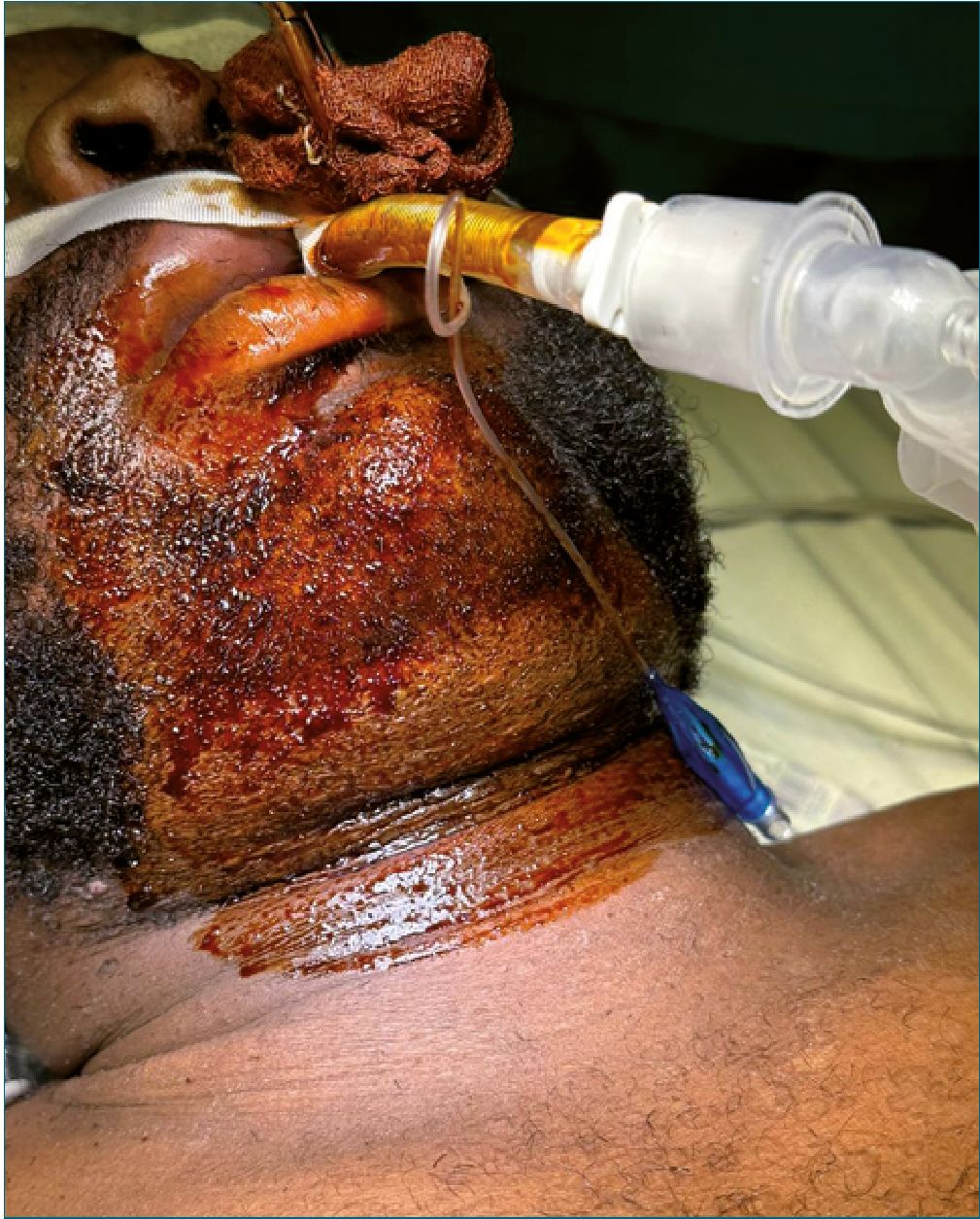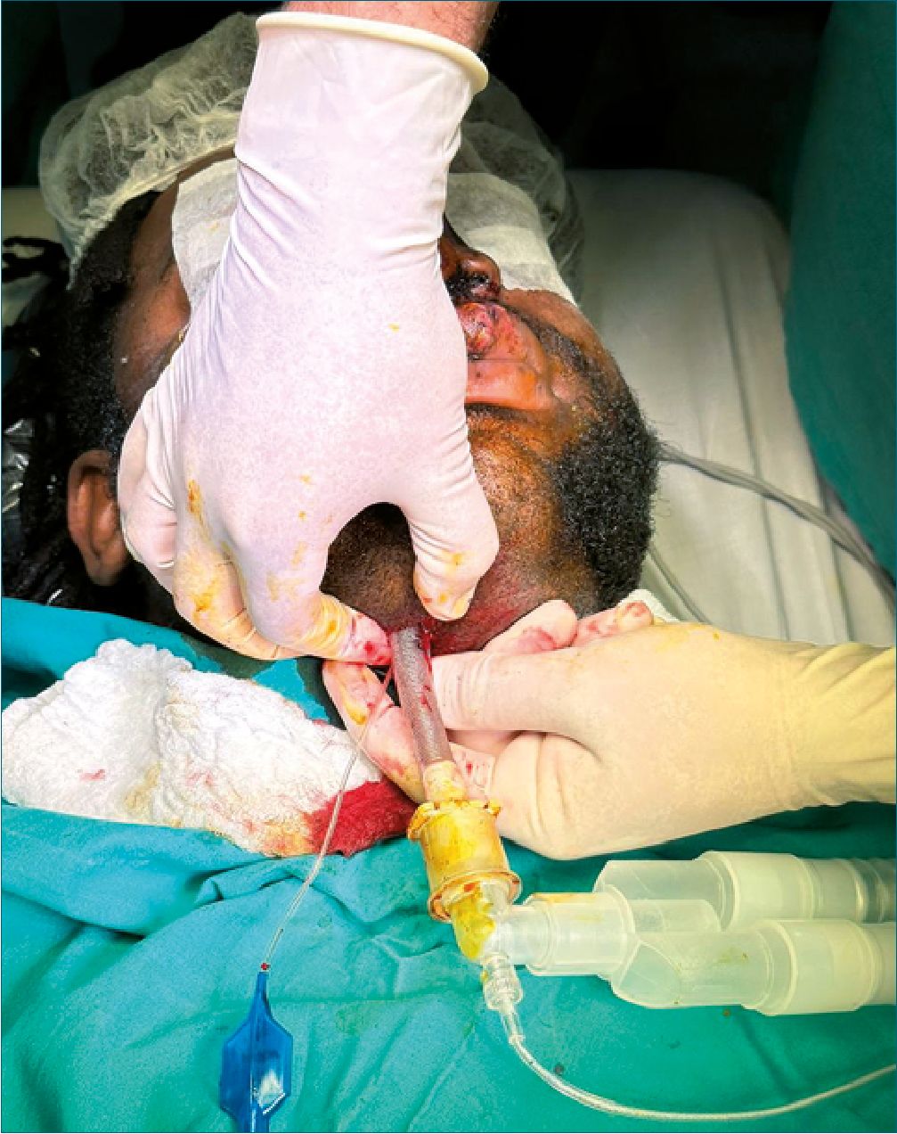 8. González-Magaña F, Malagón-Hidalgo HO, García-Cano E, Vilchis-López R, Fentanes-Vera A, Ayala-Ugalde FA. Airway management through submental derivation: a safe and easily reproduced alternative for patients with complex facial trauma. J Korean Assoc Oral Maxillofac Surg. 2018 Feb;44(1):12–7. https://doi.org/10.5125/jkaoms.2018.44.1.12 PMID:29535964