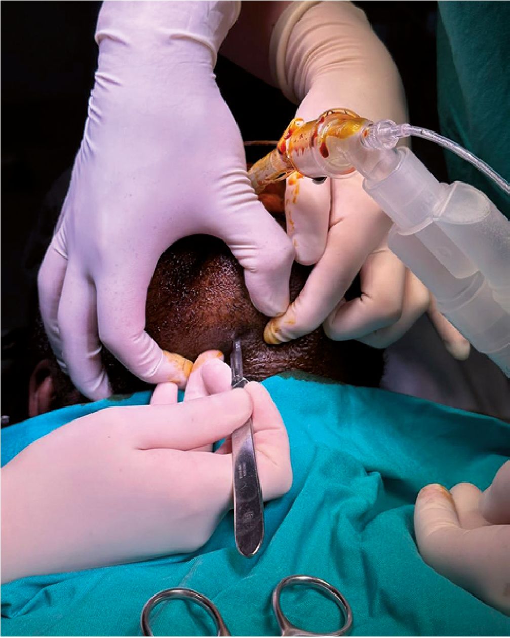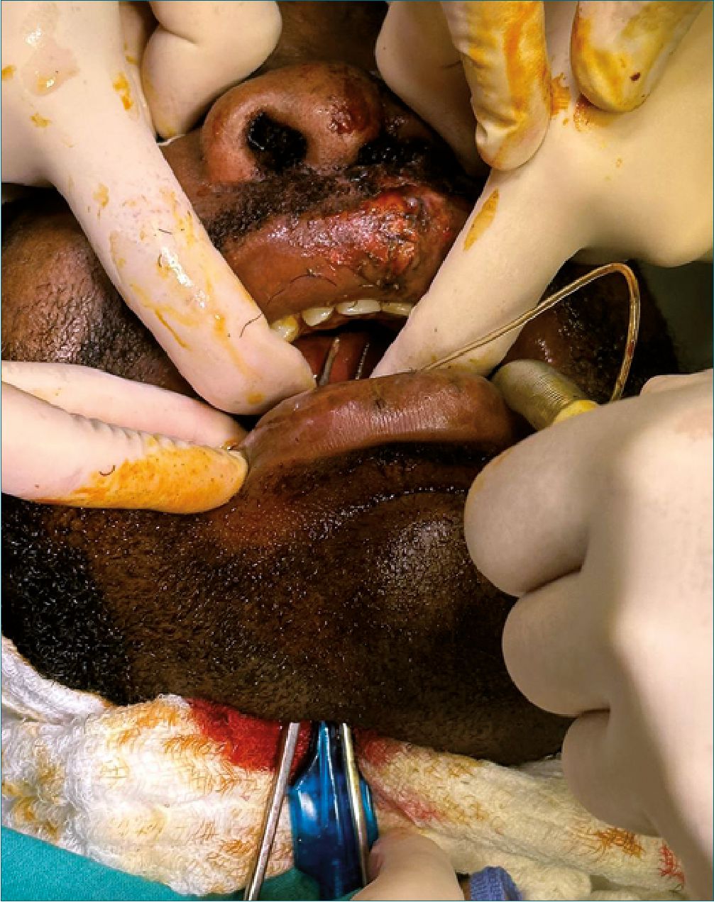 Se realiza una incisión entre 1,5 a 2 cm entre el mentón y ángulo de la mandíbula, realizando una disección roma hasta el piso de boca. Se realiza un acceso quirúrgico a través de la fascia superficial, el platisma y la fascia profunda. La apertura de la comunicación se sitúa en el piso de la boca (Figura 2).