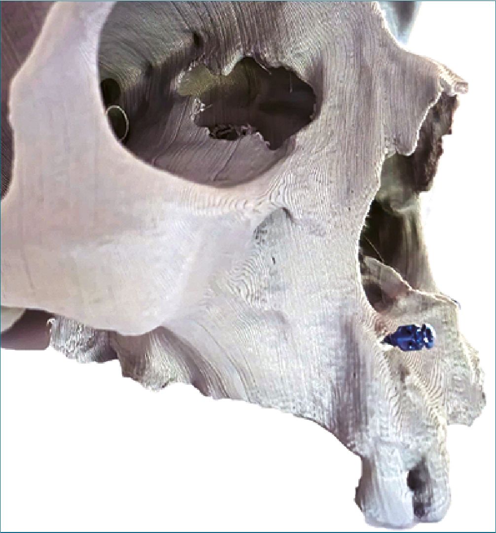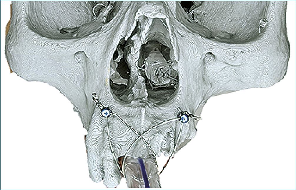 Fijación de un tornillo IMF 8 mm, entre la eminencia canina y la raíz del incisivo lateral, bilateralmente (Figura 2).