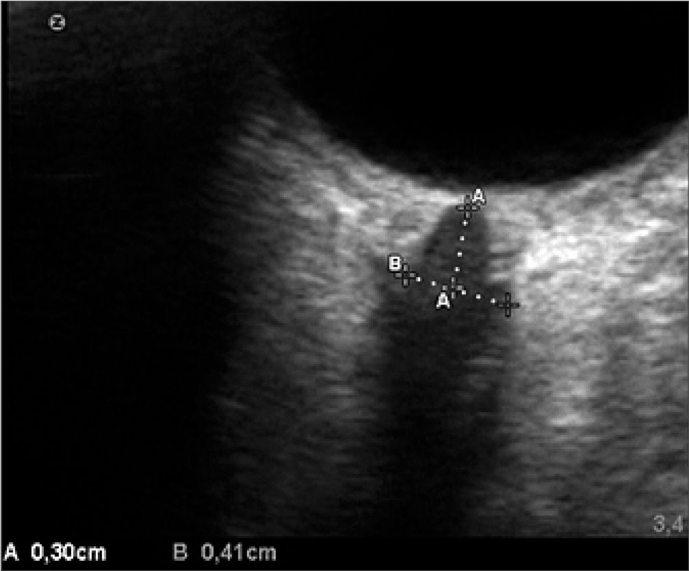 Dicha medición se realizó tanto en el plano sagital como en el axial del globo ocular; de ellas, se determino la mejor imagen, la cual fue definida como aquella con una visualización adecuada de la entrada del nervio óptico al globo ocular, los límites de la VNO y el nervio óptico. Esta se congeló, y se midió el DVNO 3 mm detrás del globo ocular a lo largo del eje perpendicular al disco óptico (Figuras 1 y 2).