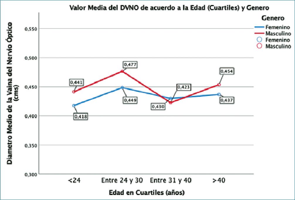 Se obtuvo un DVNO promedio de 0,43 cm, con una DE ± 0,03 cm, (p25 = 0,38 cm; p75 = 0,49 cm). El 95,3% de las mediciones fueron < 0,55 cm (Tabla 2). El promedio del DNVO en mujeres fue de 0,43 cm ± 0,0046 cm y en hombres fue de 0,44 cm ± 0,0070 cm, (p = 0,187), (Tabla 3). Al hacer una comparación de los grupos de edad por cuartiles, se identificaron resultados estadísticamente significativos ANOVA p = 0,014, test Scheffe p = 0,031, lo cual demuestra diferencias entre menores de 24 años y entre 24 a 30 años (Gráfico 1). Con la regression lineal bivariada se encontró una correlación estadísticamente significativa con el peso p = 0,012, la talla p = 0,005, TAM p = 0,005. No obstante, al realizar la regresión lineal múltiple se puede concluir que ningún modelo es factible, lo cual excluye una predicción a partir de un modelo múltiple para el valor de la media del DNVO (Tabla 4).